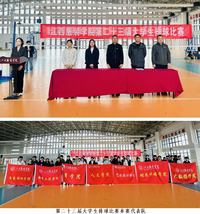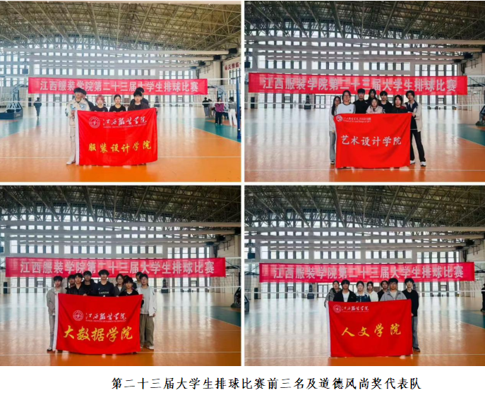 【军体部讯】为扎实推进大学生体质提升专项行动,积极构建“校—院—班”三级竞赛体系,确保实现“周周有预赛,月月有决赛,人人都参与”的校园体育文化氛围,2026年3月24日,江西服装学院第二十三届大学生排球比赛在体育馆隆重开幕。在为期一周的比赛中,来自7个学院的7支参赛代表队,共72位参赛选手在排球场大展风采,经过激烈角逐,最终服装设计学院荣获第一名,艺术设计学院荣获第二名,大数据学院荣获第三名,人文学院荣获道德风尚奖。